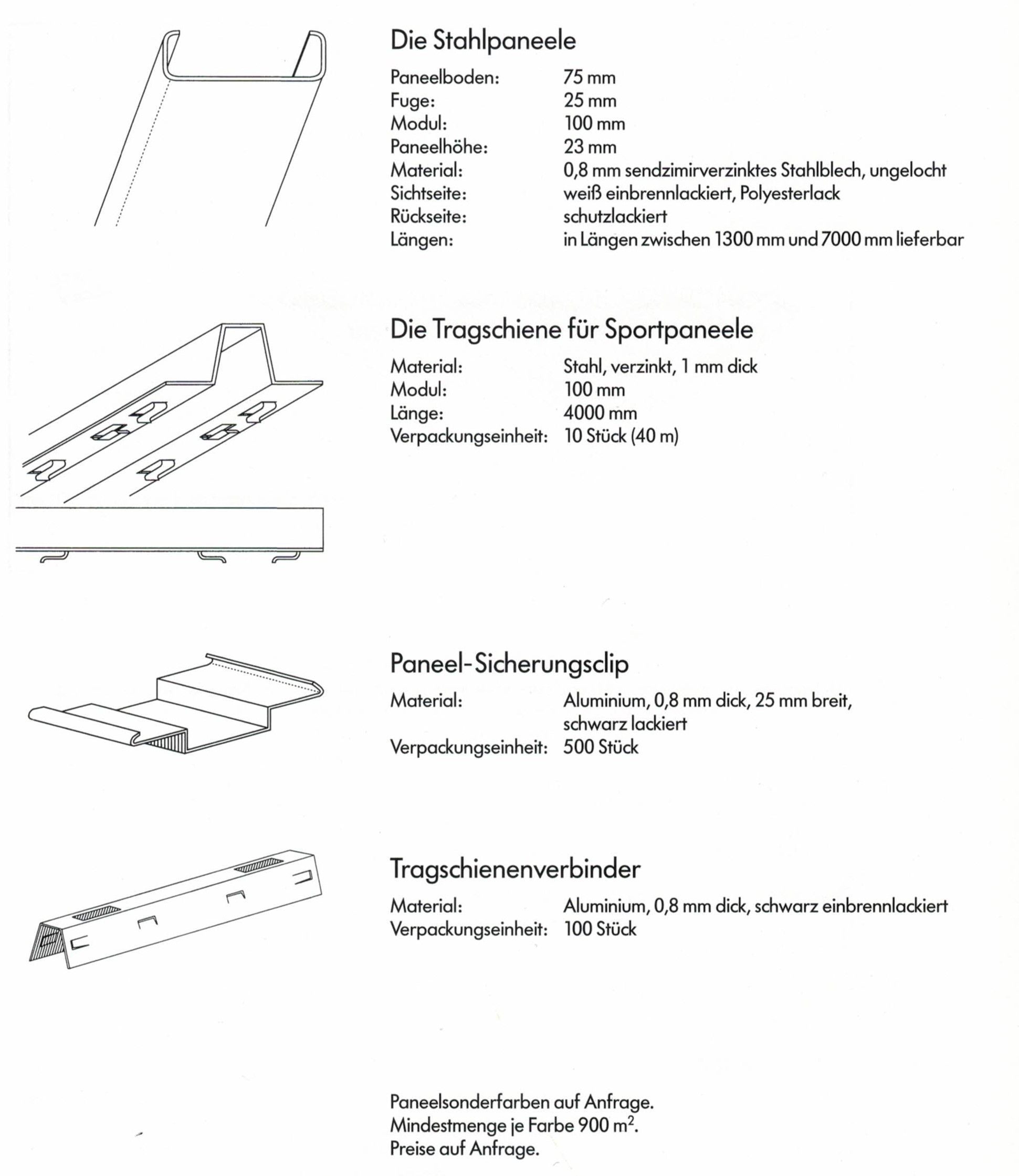 Pos. 1 ca. .......... m² BRF Sport-Paneeldeckenverkleidungen, nach DIN 18 032, Modul 100, bestehend aus sendzimirverzinkten Stahlblechpaneelen, Sichtseite matt weiß (ähnlich RAL 9010) einbrennlackiert, 0,8 mm dick, kantig, 75 mm breit, 23 mm hoch