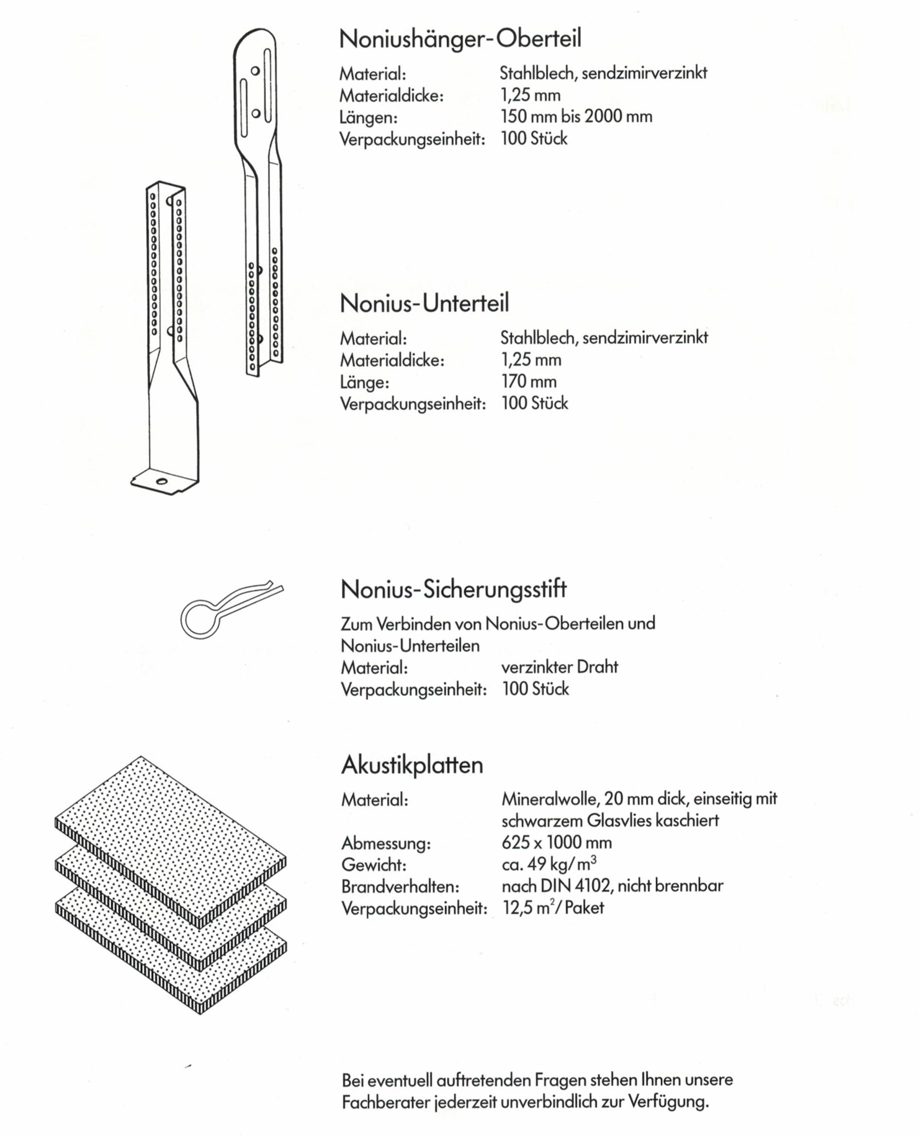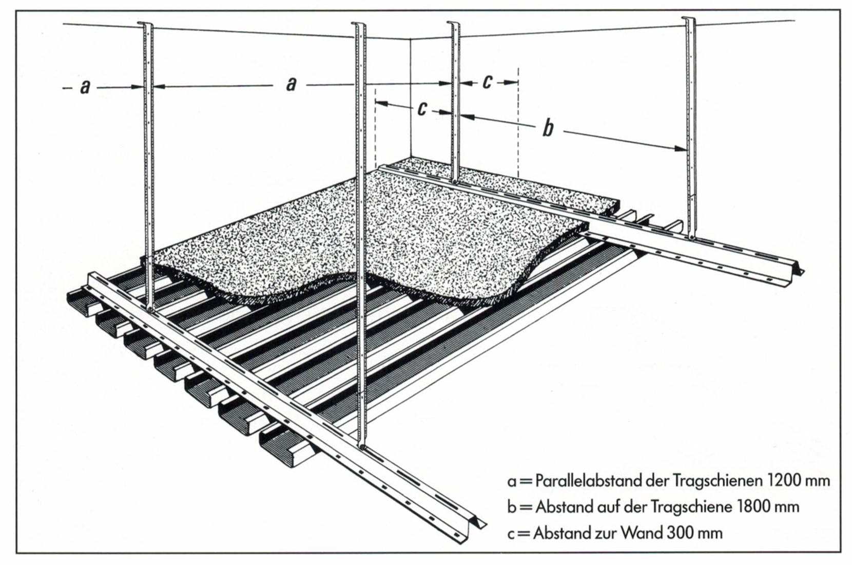 Von der Rohdecke werden hutförmige Stahltragschienen, verzinkt, 1 mm dick, mittels Noniusabhängern ca. ......... cm abgehängt. Der Abstand der Tragschienen beträgt max. 1,20 m, der Hängerabstand max. 1,80 m.